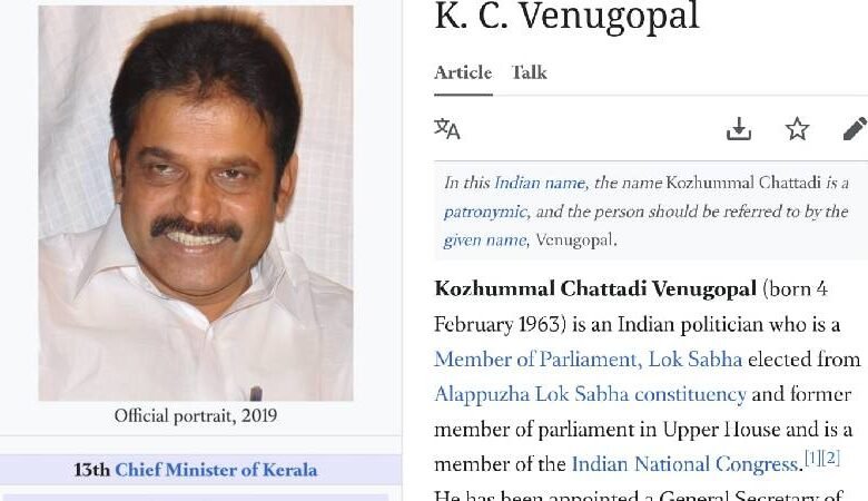 ’13ാമത് കേരള മുഖ്യമന്ത്രി’; കെ സി വേണുഗോപാലിന്റെ വിക്കിപീഡിയ പേജിലെ വിവരണത്തിൽ വിവാദം