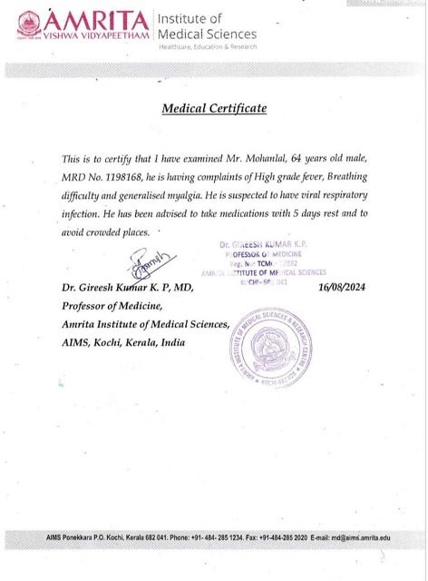 ഡോ. ഗിരീഷ് കുമാര് ആണ് താരത്തെ ചികിത്സിക്കുന്നതെന്നാണ് റിപ്പോര്ട്ട്. മോഹൻലാലിനെ ചികിത്സിക്കുന്ന ഡോക്ടറുടെ കുറിപ്പ് ആശുപത്രി അധികൃതര് പുറത്തിവിട്ടുണ്ട്. പനിക്ക് പുറമേ മസില് വേദനയും താരത്തിന് ഉണ്ടെന്നും മെഡിക്കല് സര്ട്ടിഫിക്കറ്റില് വ്യക്തമാക്കിയിട്ടുണ്ട്. ഡോക്ടര് മോഹൻലാലിന് വിശ്രമം നിര്ദ്ദേശിച്ചിട്ടുണ്ട്.