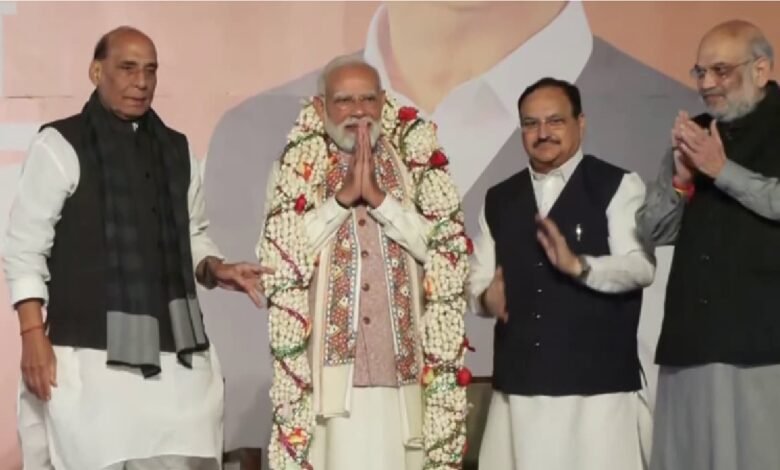 ദില്ലിയിലെ ബിജെപി ആസ്ഥാനത്ത് എത്തിയ പ്രധാനമന്ത്രി നരേന്ദ്ര മോദിയെ ബിജെപി ദേശീയ അധ്യക്ഷൻ ജെപി നദ്ദ സ്വീകരിച്ചു. പ്രതിരോധ മന്ത്രി രാജ്നാഥ് സിങ്, ആഭ്യന്തര മന്ത്രി അമിത് ഷാ എന്നിവരും മോദിക്കൊപ്പം വേദിയിലെത്തി. ബിഹാറിലെ എൻഡിഎ സഖ്യത്തിന്റെ മഹാ വിജയത്തിൽ ദില്ലിയിലെ ബിജെപി ആസ്ഥാനത്ത് വലിയ ആഘോഷമാണ് നടന്നത്. നൂറുകണക്കിന് പ്രവര്ത്തകരാണ് ആസ്ഥാനത്തെത്തിയത്. വൻ സുരക്ഷയാണ് ആഘോഷ പരിപാടിക്കായി ഏര്പ്പെടുത്തിയിരുന്നത്. എൻഎസ്ജി സംഘത്തെ അടക്കം കൂടുതൽ ഉദ്യോഗസ്ഥരെ വിന്യസിച്ചിട്ടുണ്ട്.ബിഹാറിലെ 243 സീറ്റിൽ 202 സീറ്റിലും വിജയം ഉറപ്പിച്ചാണ് എൻഡിഎയ്ക്ക് ഭരണതുടര്ച്ച ലഭിക്കുന്നത്. ഇന്ത്യാ സഖ്യം 34 സീറ്റുകളിൽ ഒതുങ്ങി. മറ്റുള്ള കക്ഷികള് ഏഴു സീറ്റിലാണ് വിജയിച്ചത്.
