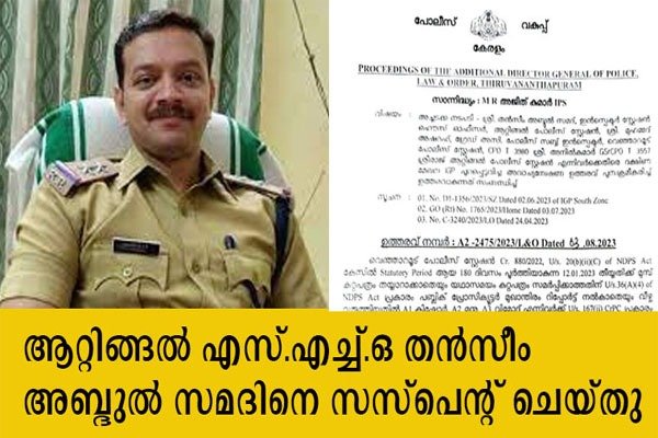 ആറ്റിങ്ങല് എസ്.എച്ച്.ഒ തന്സീം അബ്ദുല് സമദിനെ സസ്പെന്റ് ചെയ്തു