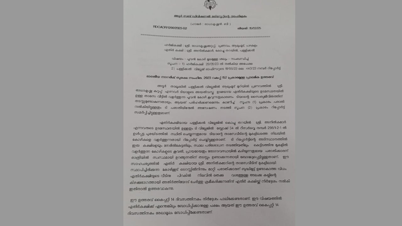പുലർച്ചെ മൂന്നു മുതൽ പൂവൻകോഴി കൂവുന്നത് പതിവ് പ്രശ്നപരിഹാരമായി ആർടിഒ ഇറക്കിയ ഉത്തരവ് ഇങ്ങനെ