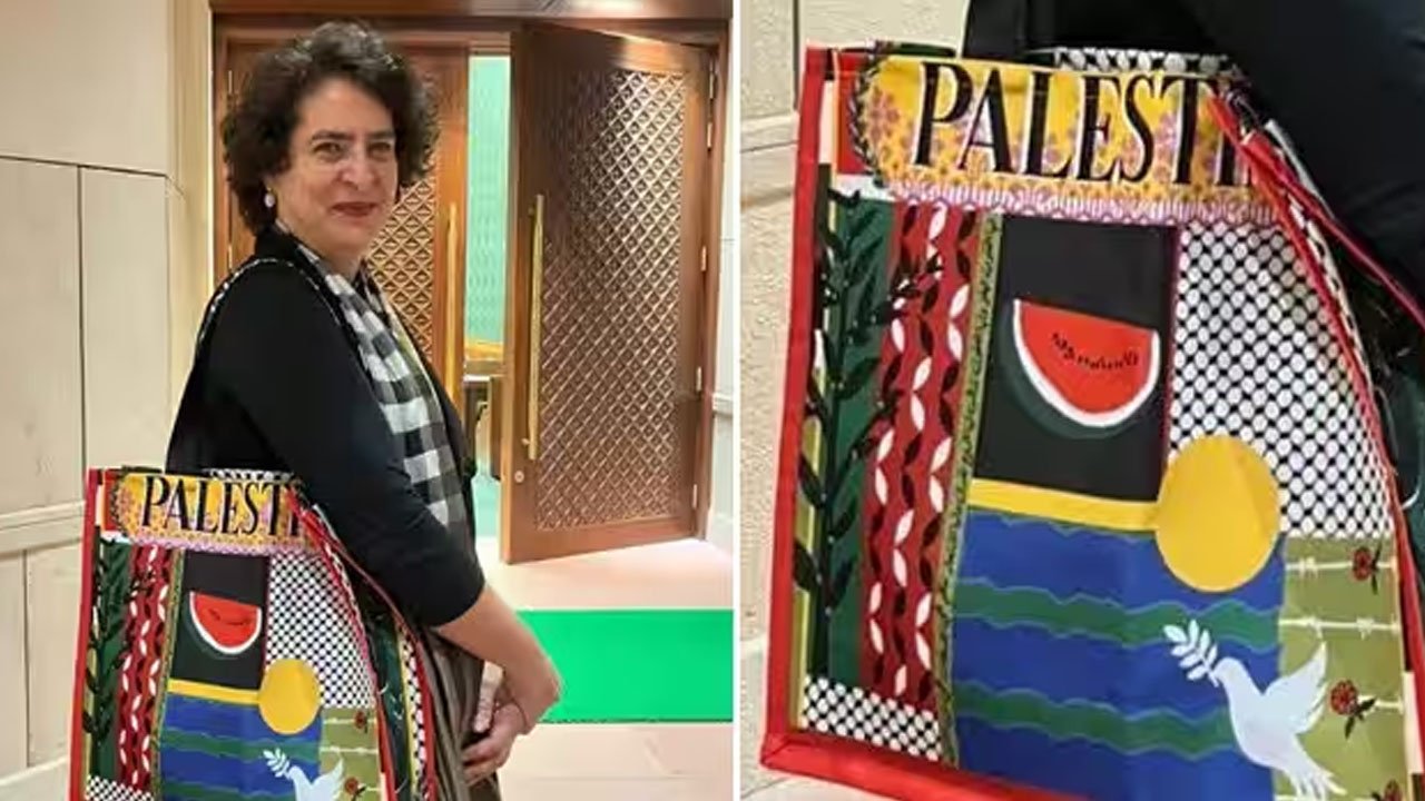 പലസ്തീന്’ ബാഗുമായി പ്രിയങ്കാ ഗാന്ധി പാര്ലിമെന്റില്