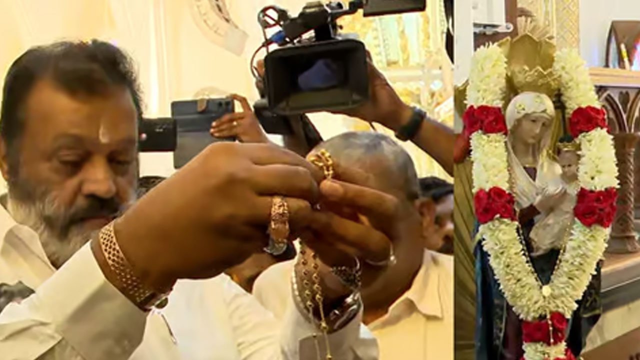 സുരേഷ് ഗോപി ലൂർദ് പള്ളിയിലെത്തി; സ്വർണ കൊന്ത സമർപ്പിച്ചു