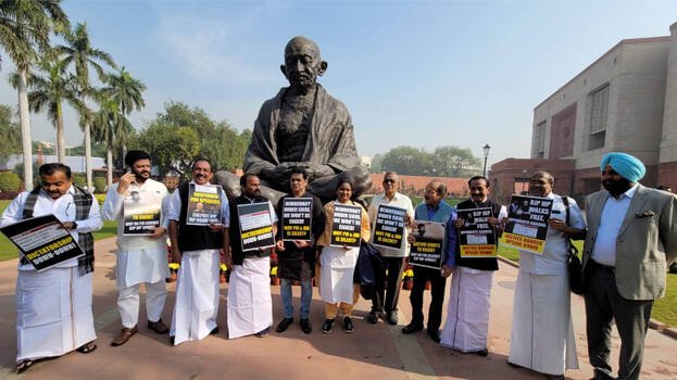 ലോക്സഭയിലെ പ്രതിഷേധം: ഗാന്ധി പ്രതിമയ്ക്ക് മുമ്പില് സസ്പെന്ഷനിലായ എംപിമാര് പ്രതിഷേധം നടത്തി