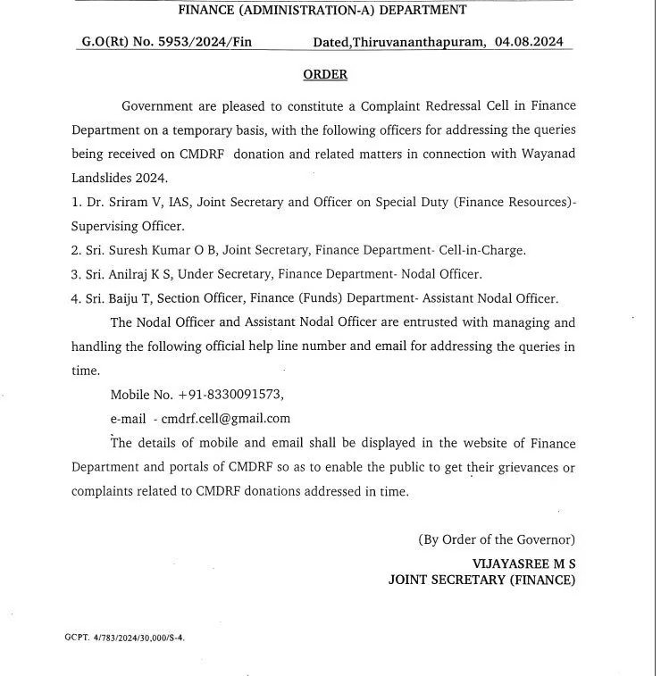 തിരുവനന്തപുരം: മുഖ്യമന്ത്രിയുടെ ദുരിതാശ്വാസനിധിയുമായി ബന്ധപ്പെട്ട് ധനവകുപ്പ് പരാതി പരിഹാരസെല്‍ രൂപീകരിച്ചു. വയനാട് ഉരുള്‍പൊട്ടലുമായി ബന്ധപ്പെട്ട വിഷയങ്ങളാണ് പരിശോധിക്കുക. ശ്രീറാം വി. ഐ.എ.എസ്സിന്റെ നേതൃത്വത്തിലാണ് സമിതി പ്രവർത്തിക്കുക.