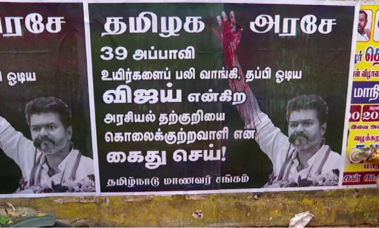 കരൂര് റാലി ദുരന്തം ; കൊലയാളിയായ വിജയ്യെ അറസ്റ്റ് ചെയ്യുക, നടൻ വിജയ്ക്കെതിരെ പോസ്റ്ററുകൾ