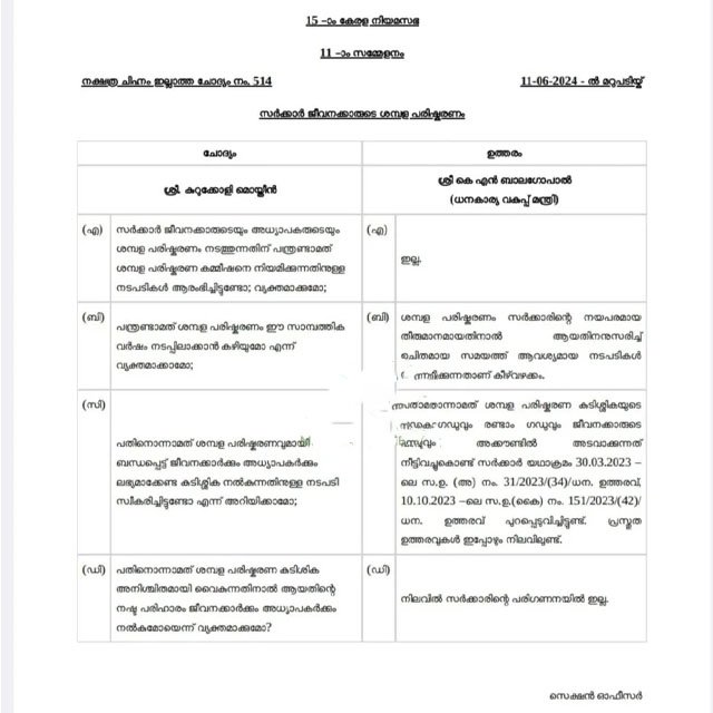 മൂന്നാം ഗഡു തെരഞ്ഞെടുപ്പ് പെരുമാറ്റ മാനദണ്ഡത്തിൽ കുരുക്കി ധനവകുപ്പിൽ ഉറക്കത്തിലാണ്. പെരുമാറ്റ ചട്ടം കഴിഞ്ഞിട്ടും ആ ഫയൽ ഉറക്കത്തിൽ നിന്ന് എഴുന്നേറ്റിട്ടില്ല. ജൂലൈ 1 മുതൽ പന്ത്രണ്ടാം ശമ്പള പരിഷ്കരണം പ്രാബല്യത്തിൽ വരേണ്ടതാണ്. കമ്മീഷനെ നിയമിക്കുന്ന നടപടി ആരംഭിച്ചിട്ടില്ലെന്നാണ് കെ.എൻ ബാലഗോപാലിൻ്റെ നിയമസഭ മറുപടി.