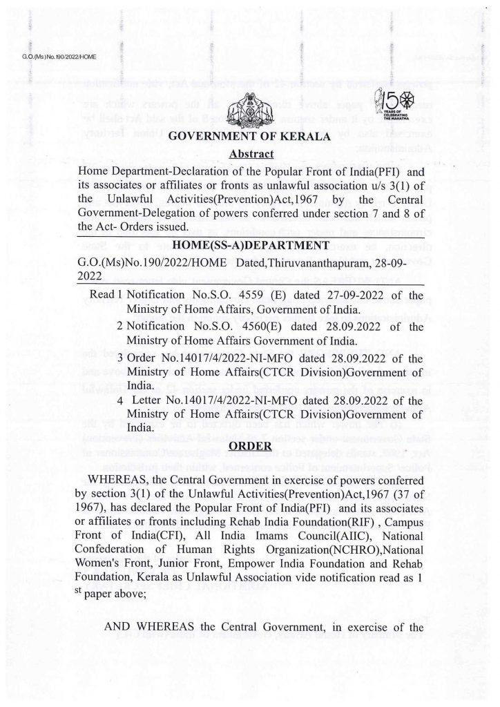 പോപ്പുലര്‍ ഫ്രണ്ട് നിരോധനം: കേന്ദ്ര നിര്‍ദ്ദേശം കര്‍ശനമായ നടപ്പക്കാന്‍ സംസ്ഥാന സര്‍ക്കാരും; ഉത്തരവിറങ്ങി, പിഎഫ്‌ഐ ഓഫീസുകള്‍ സീല്‍ ചെയ്യും