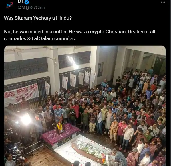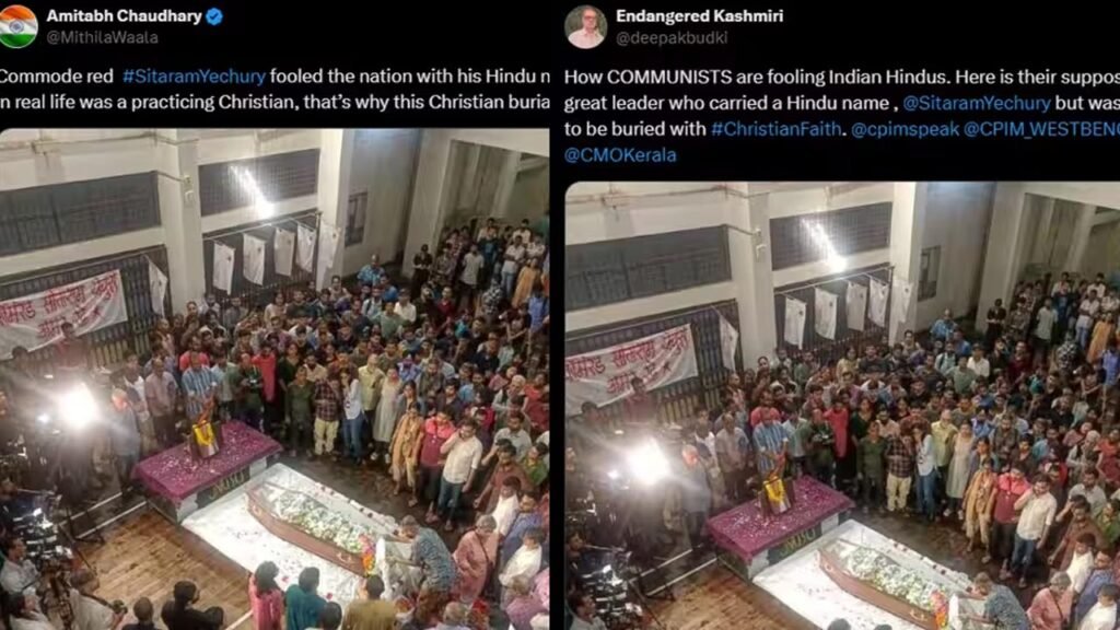 സീതാറാം യെച്ചൂരിയെ ക്രിസ്ത്യന് മതാചാരപ്രകാരം സംസ്കരിച്ചതായുള്ള സോഷ്യല് മീഡിയയിലെ പ്രചാരണം വ്യാജം