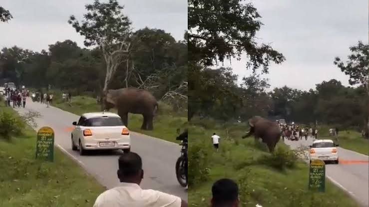 വാഹനം നിര്ത്തുന്നതിന് കര്ശന നിരോധനമുള്ള മേഖലയില് സഞ്ചാരികള് വാഹനം നിര്ത്തി ഫോട്ടോയെടുക്കുന്നതിനിടെയാണ് ആനയുടെ ആക്രമണം ഉണ്ടായത്. പരിക്കേറ്റ ആള് അടക്കം നിരവധി പേര് റോഡില് ഇറങ്ങി.